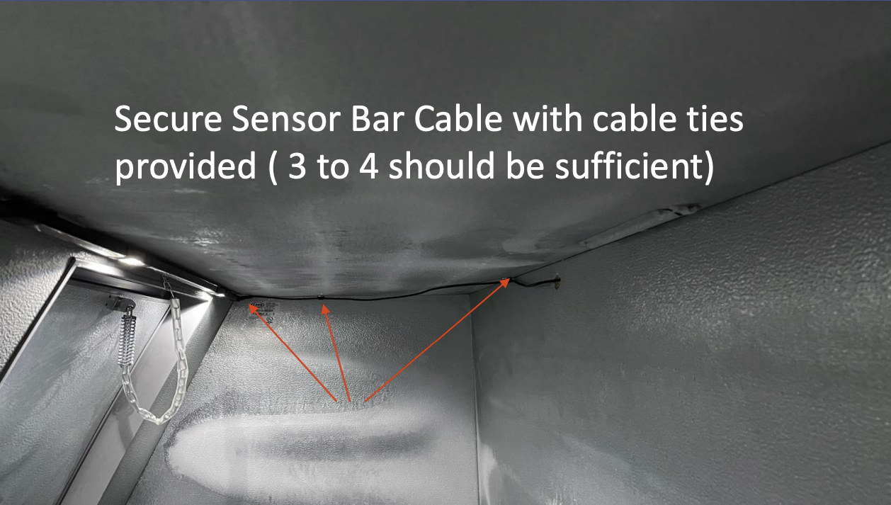 Next, mount the Sensor array on the front of the freezer centered left to right. Just make sure the distance on each side is the same. Measure each side and slide the Sensor array (left to right), until the Sensor array end is the same distance to the edge of the freezer as shown in the diagram below.
